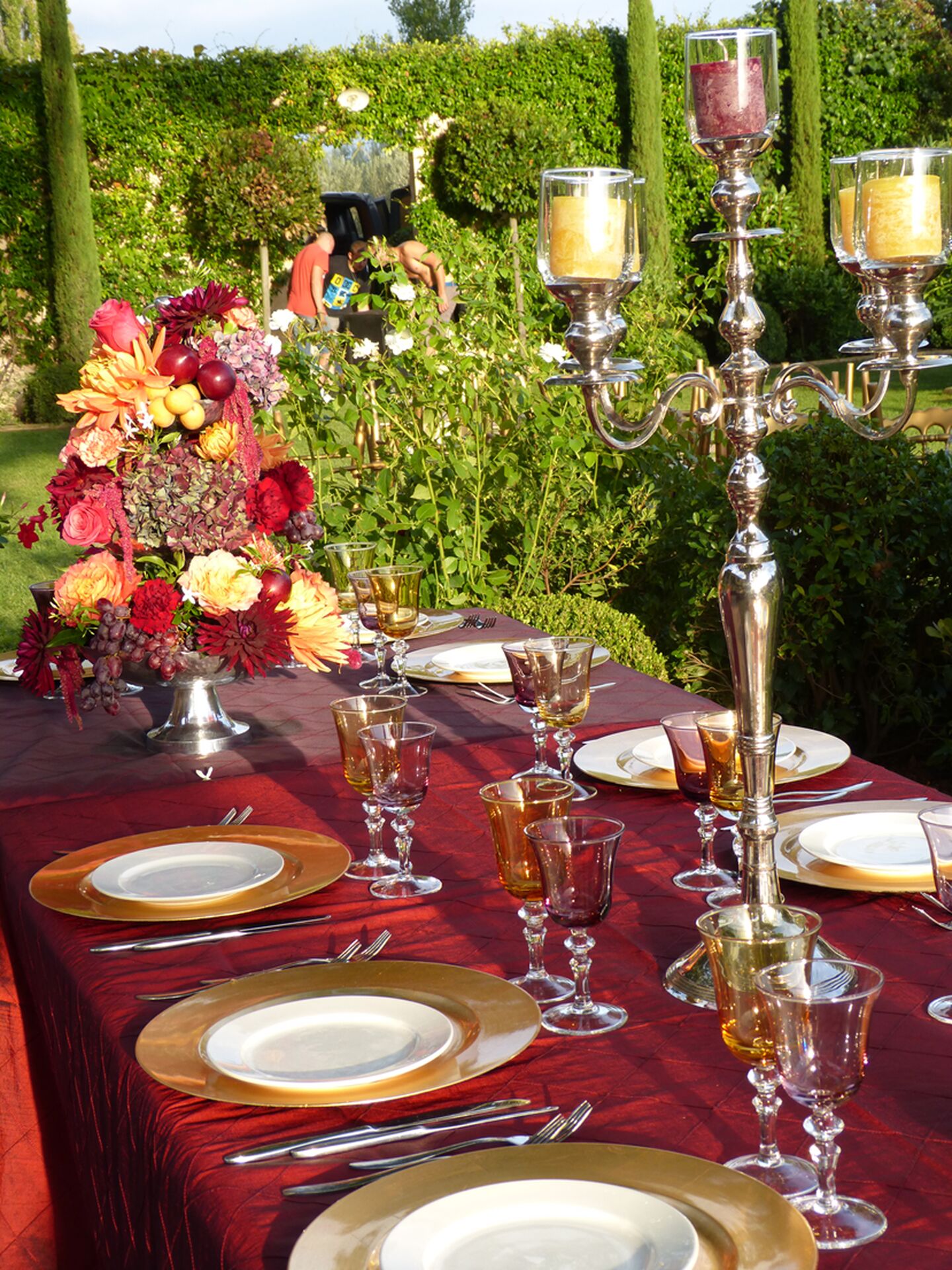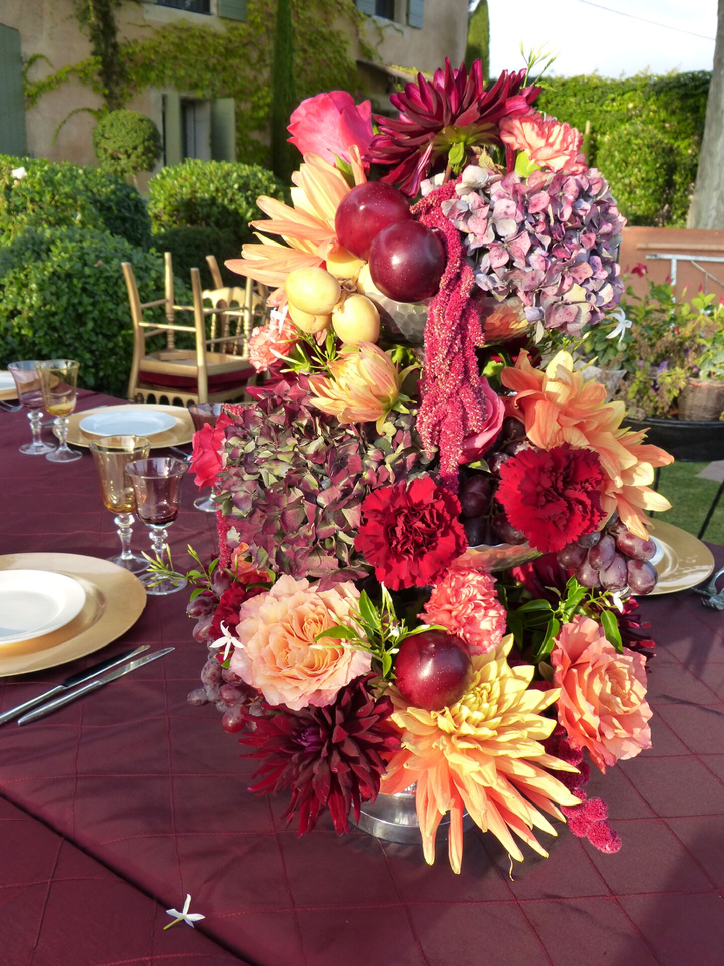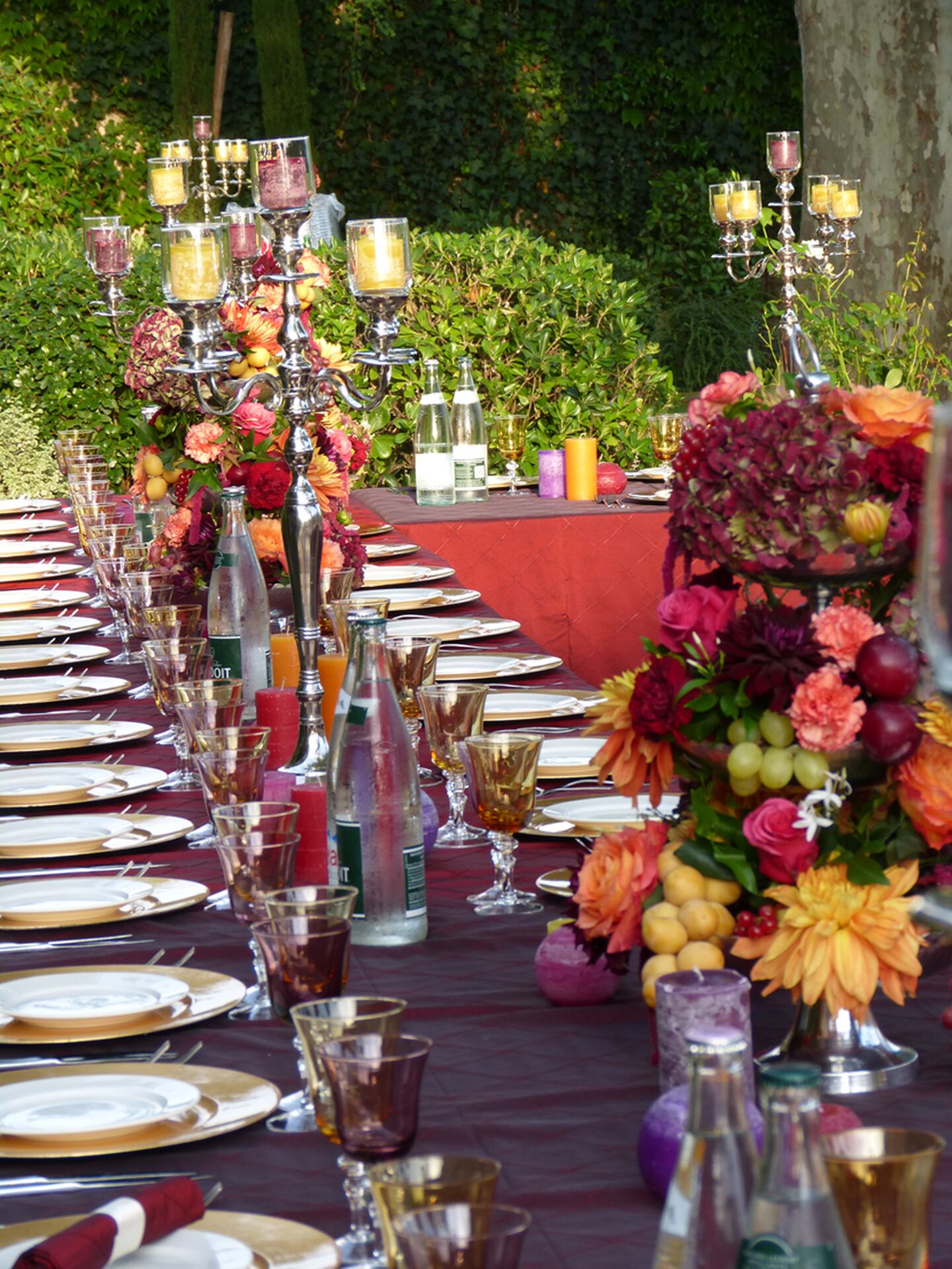 Des tables installées dans la longueur en format de banquet, épousant la forme d'une terrasse provençale et l'espace laissé entre les platanes centenaires, des nappes au pourpre flamboyant, des assiettes dorées assorties aux chaises Napoléon ont crée une ambiance de mariage aux accents des 10001 nuits.