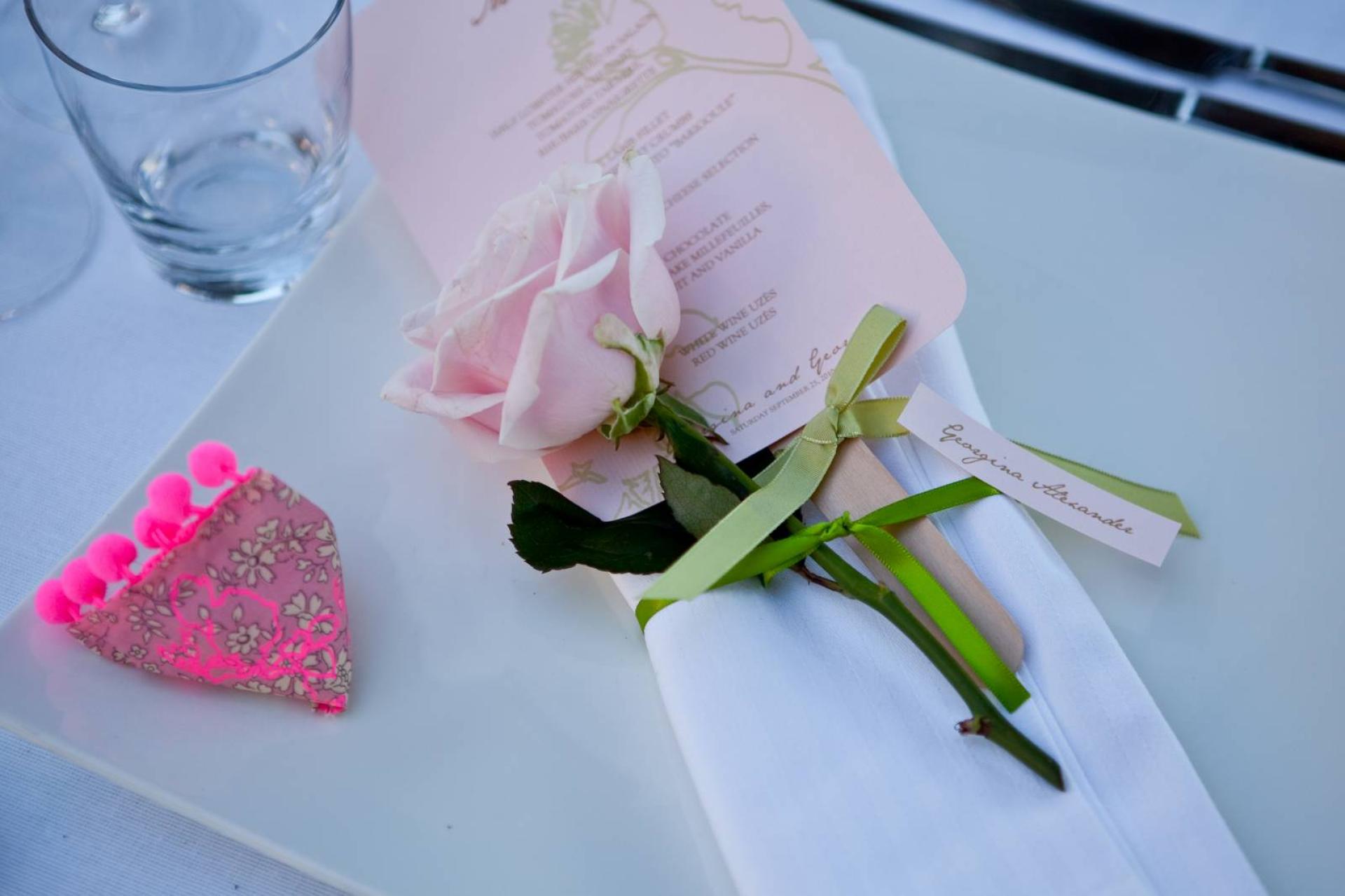 Déclinaison en plan de table dans un très bel olivier centenaire, des cadeaux invités pour les femme ”Berlingot Sent bon” en tissu Liberty senteur fleur de coton, les hommes ont été mis à l'honneur avec des cigares aux bagues personnalisées et des sphères garnies de Macarons. Egalement, des biscuits Sablés à la vanille personnalisés avec leurs prénoms étaient offerts à tous les invités, un menu sucette marque place de couleur vieux rose posé délicatement sur les serviettes de table… un Candy Bar garni essentiellement de spécialités françaises en rose et vert (calissons, nougats...) a animé la soirée dansante ainsi qu'un wedding cake purement british !
