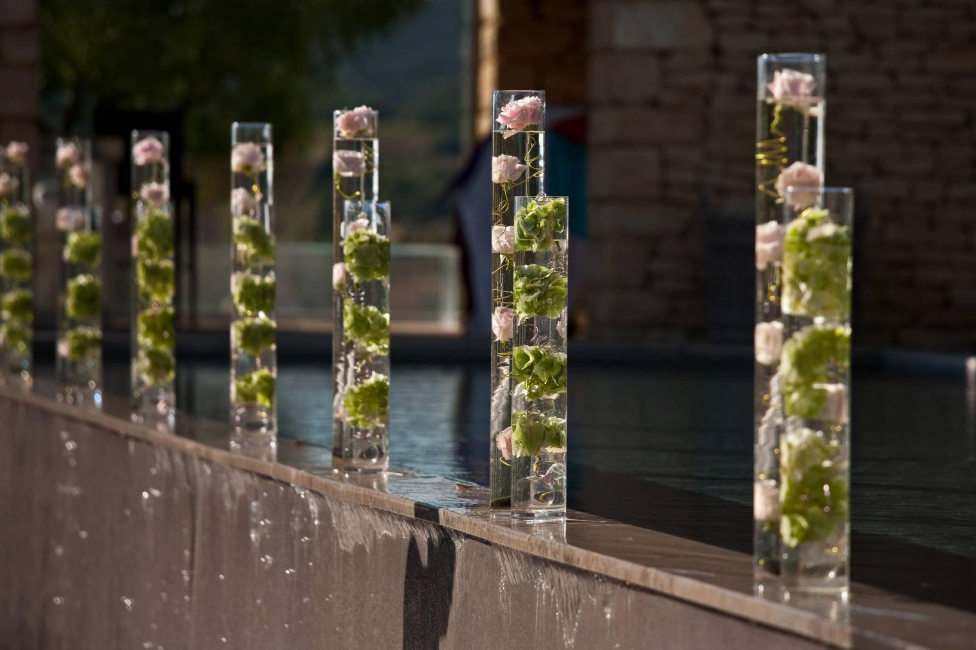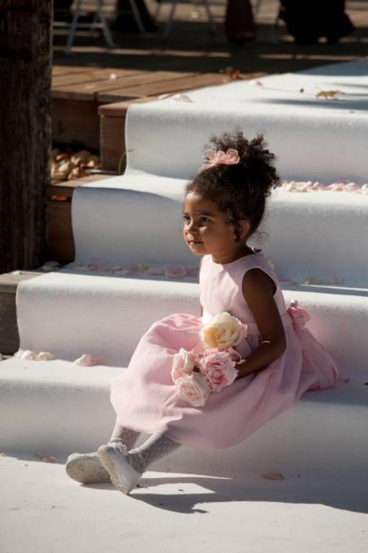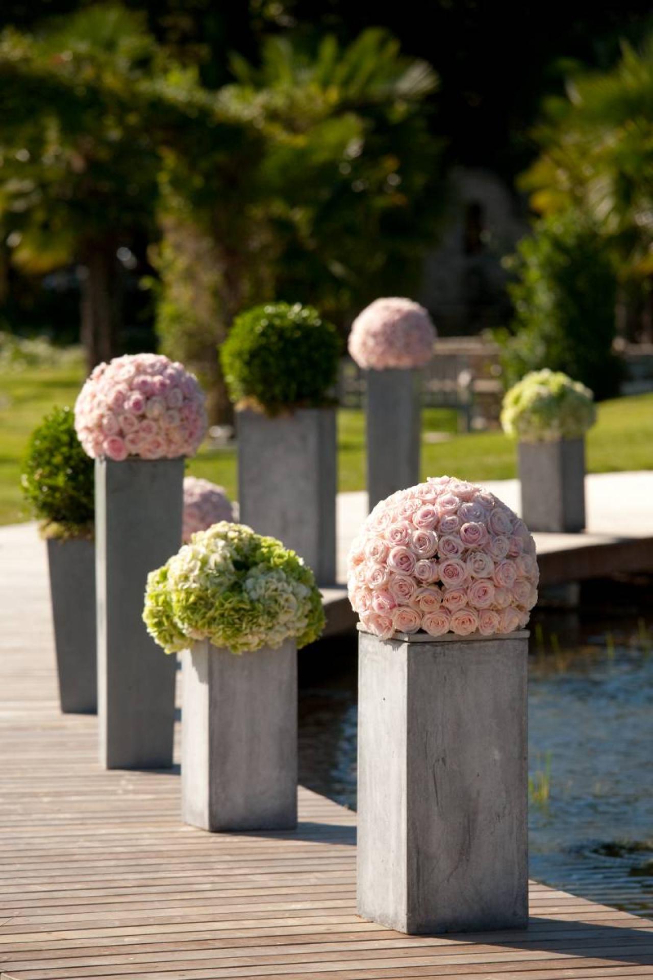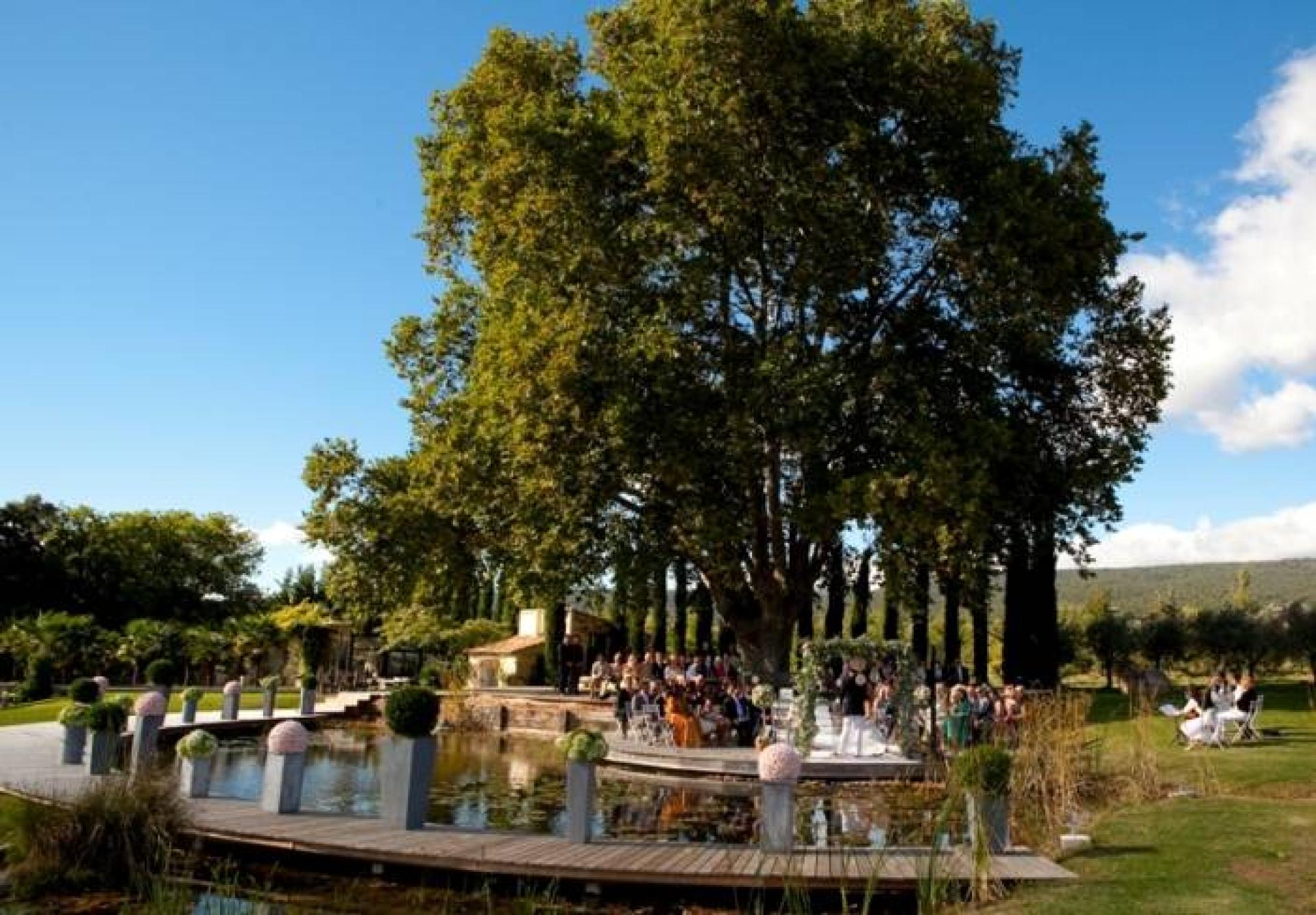 La cérémonie de mariage laïque célébrée par un officiant s'est tenue sous un platane que l'on croirait millénaire au son d'un quatuor classique, au bord d'un plan d'eau digne tout droit sortie d'une toile du maître Monet. Les compositions florales de boules de roses et d'hortensias ont balisé le chemin jusqu'au cocktail organisé sur le bord d'une piscine à débordement.