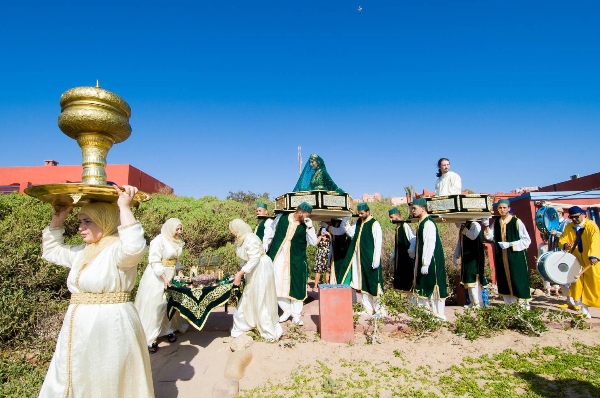 Réunis en premier lieu autour d'une cérémonie du henné et du thé sur le sable au milieu des dunes, les invités ont ensuite été conviés par une troupe de gnaouas en procession vers le lieu de dîner autour de la piscine.