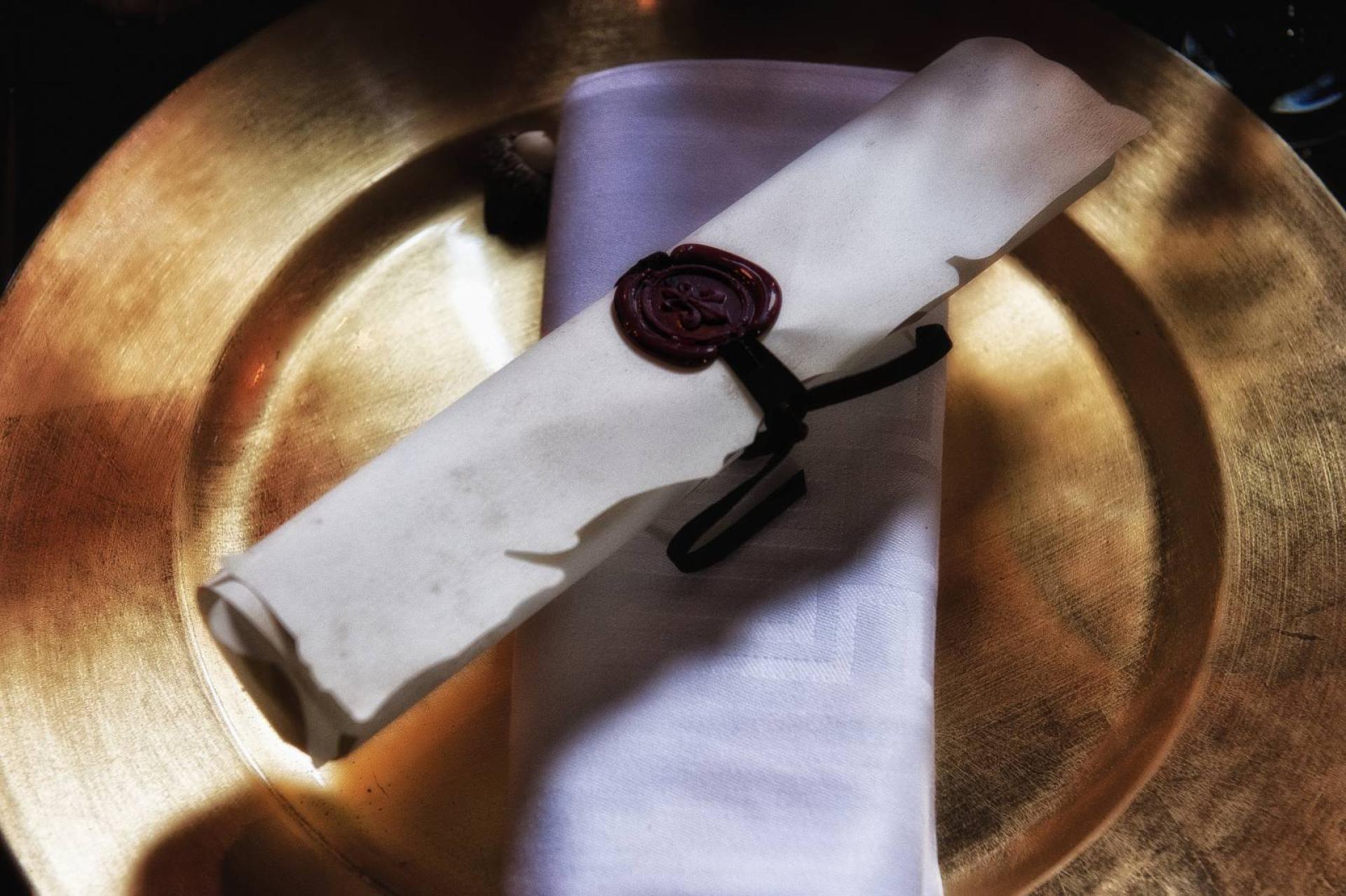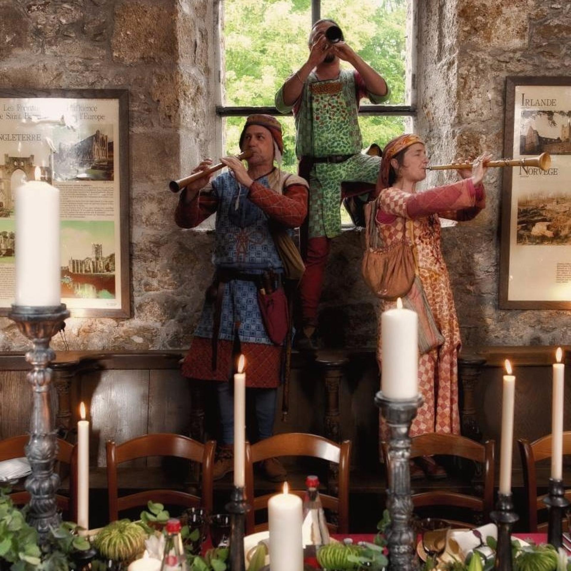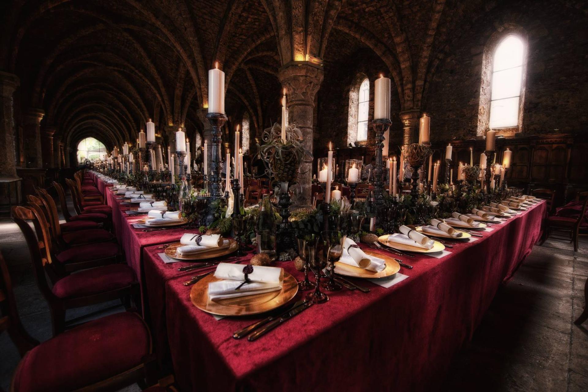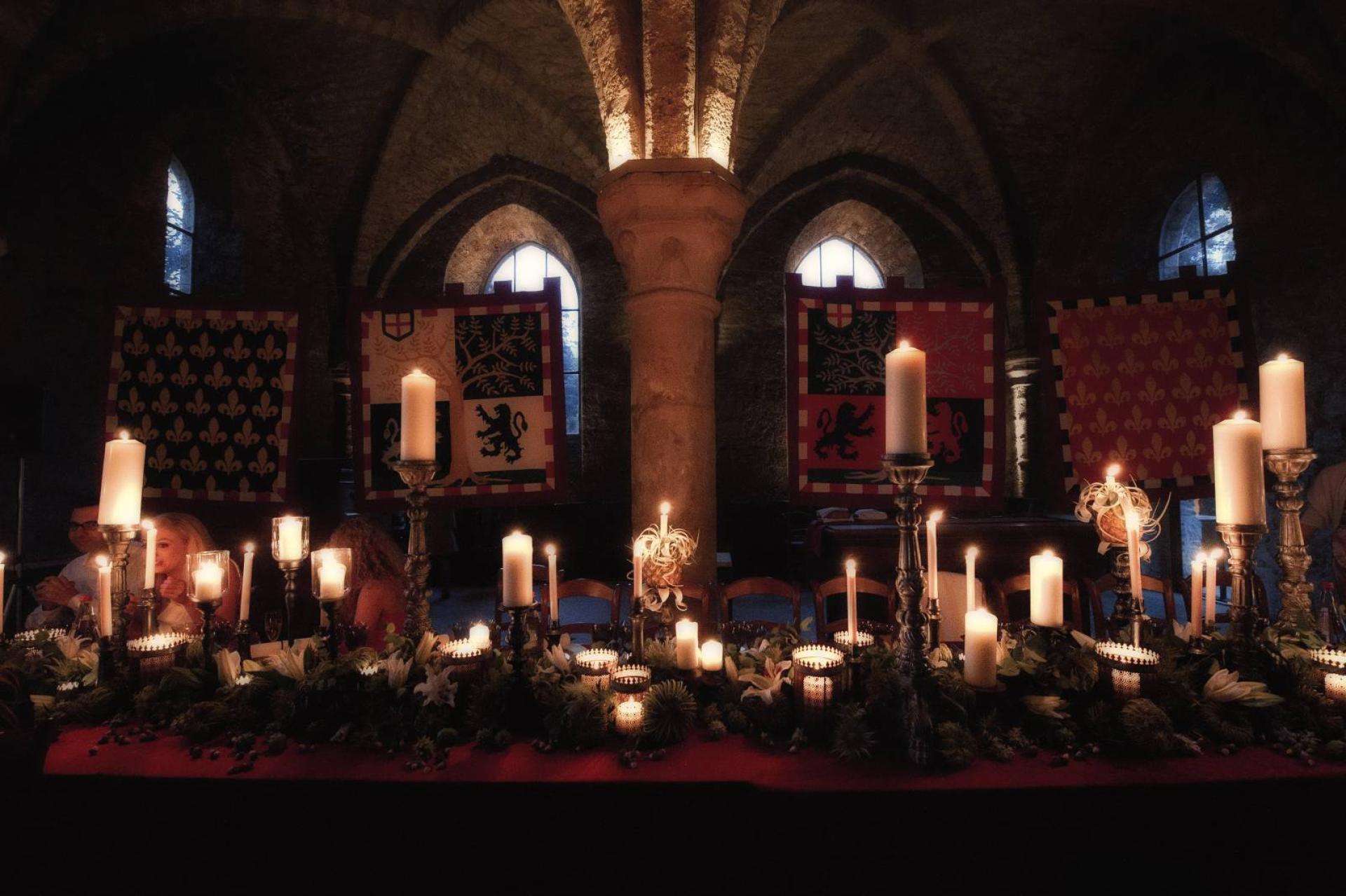 Une grande tablée de près de 250 invités prenant toute la longueur de l'espace a été recouverte d'un immense chemin de table de compositions végétales (graminés, fleurs des champs, ananas...). Quatre grandes bannières aux écussons médiévaux, réalisées sur-mesure, copies de blasons authentiques, ont été suspendues aux voûtes afin de donner un rendu encore plus médiéval au-dessus de la table des mariés tels un roi et une reine trônant. Des parchemins au cachet de cire en guise de menus ont été apposés dans les assiettes chinées pour l'occasion. Tout l'art de la table a reproduit la vaisselle de l'époque.