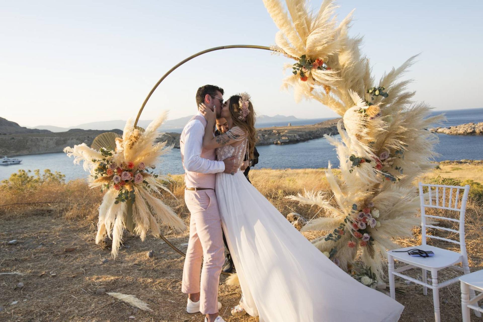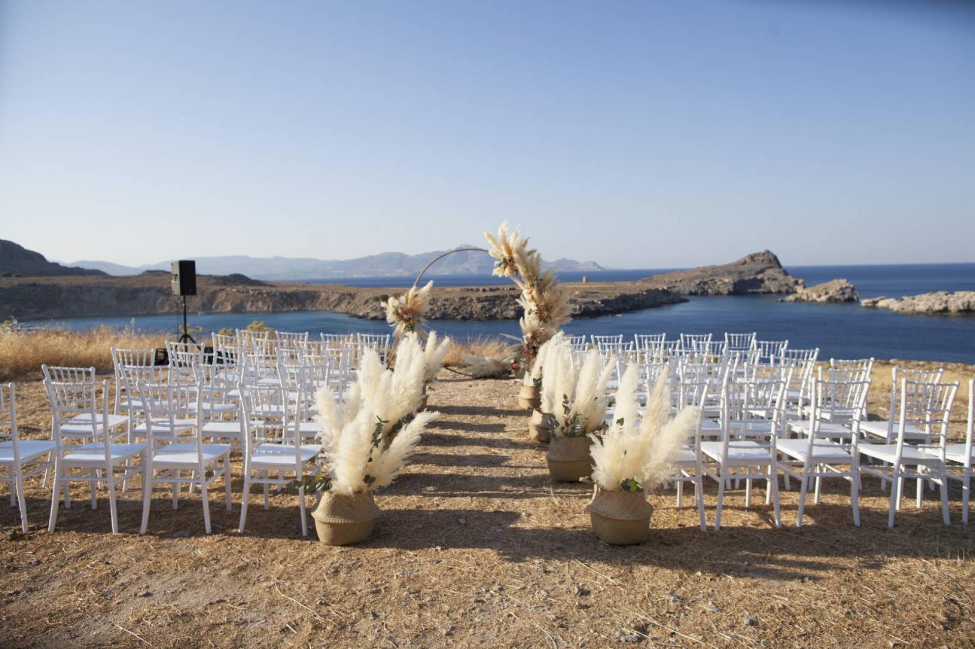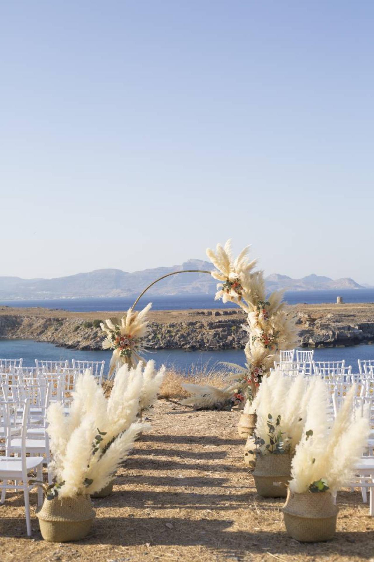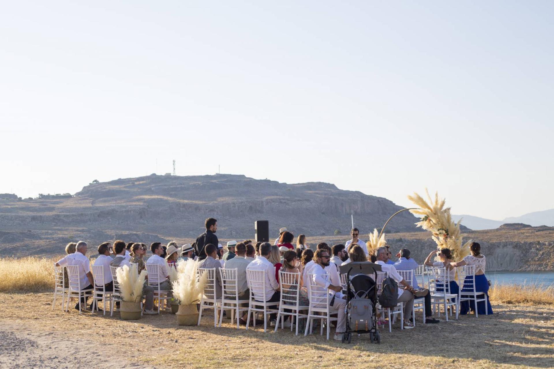 Les mariés sont arrivés à la cérémonie laïque en bateau au pied de l'Acopole de Lindos. Cette cérémonie symbolique décorée par Zoé de Lindos Flowers a été agrémentée par une jolie arche ronde fleurie avec fleurs fraiches et pampas et de jolis bouquets de chaises. La réception s'est ensuite tenue dans les jardins de la villa sous des guirlandes guinguettes au rythme d'un disc-jockey club jusqu'au bout de la nuit.