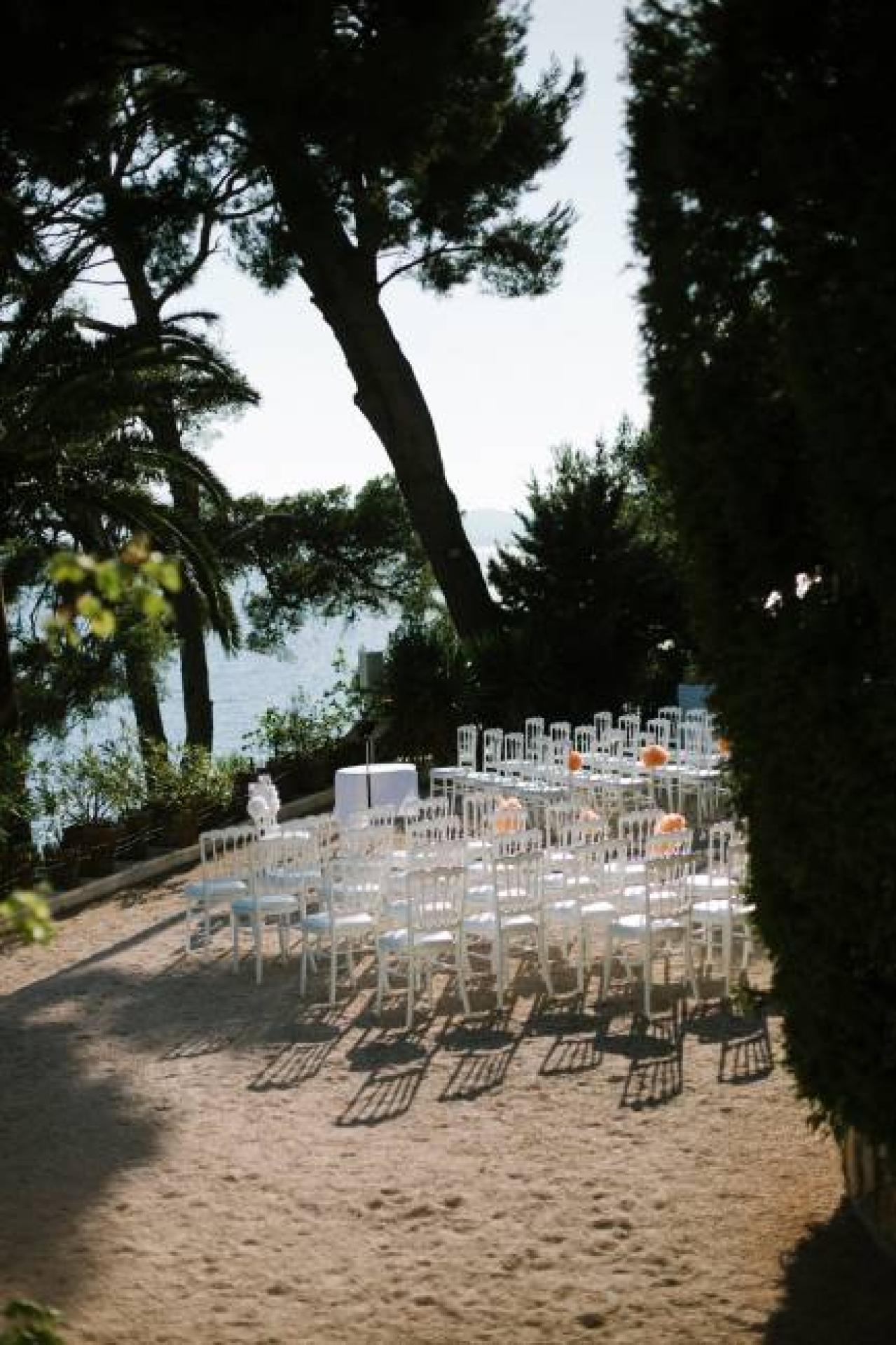 Perchée sur le Cap d'une Résidence somptueuse, la cérémonie laïque s'est déroulée sous les palmiers et le dîner sur la terrasse surplombant la mer.